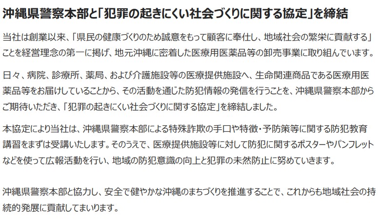 TOP >CSR活動 > 沖縄県警察本部と「犯罪の起きにくい社会づくりに関する協定」を締結 沖縄県警察本部と「犯罪の起きにくい社会づくりに関する協定」を締結 2025.11.12 浦西中学校で熱中症対策の啓発・普及活動とスポーツ飲料の寄贈を実施 健康啓発講演会を開催しました